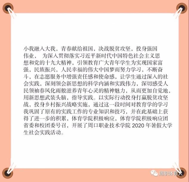 周口职业技术学院体育学院阳光体育志愿服务队在李海磊、史帅两位老师的带领下开展了为期十余天的社会实践活动,光阴似箭,岁月如梭,社会实践生活也接近尾声,一直以来,每个队员对社会体育志愿社会实践事业充满了热诚。在实践工作中都能够求真务实、开拓进取、大胆创新、乐于奉献,努力做好每次实践活动,圆满地完成本职工作。在学习实践中,更能够严格要求自己,以身作则,凡是要求学生做到的,自己先要做到。